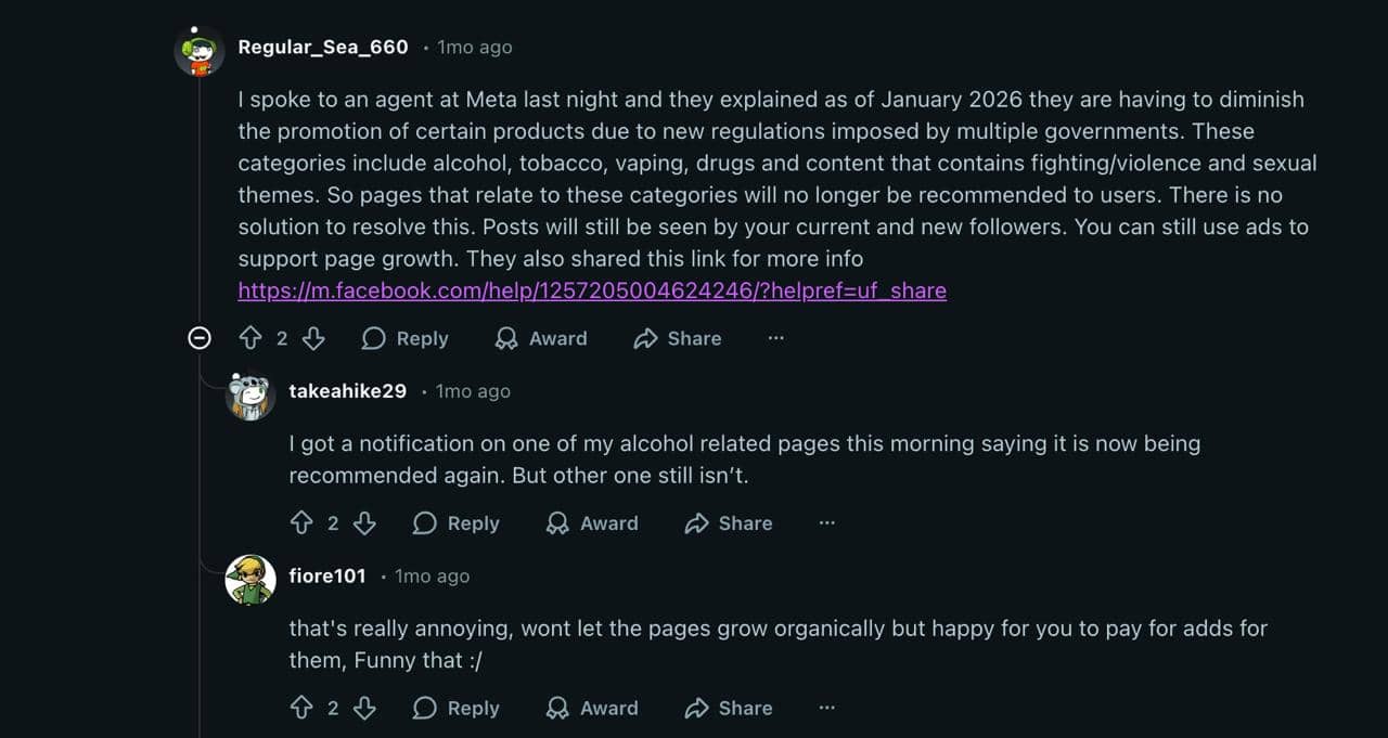 Facebook is limiting recommendations for Pages tied to alcohol, tobacco, vaping, drugs, violence, and sexual themes due to regulatory pressure in multiple countries. Affected Pages may still post and reach existing followers, but they can lose access to recommendation surfaces. That means no suggested Page boosts, no organic discovery pushes.