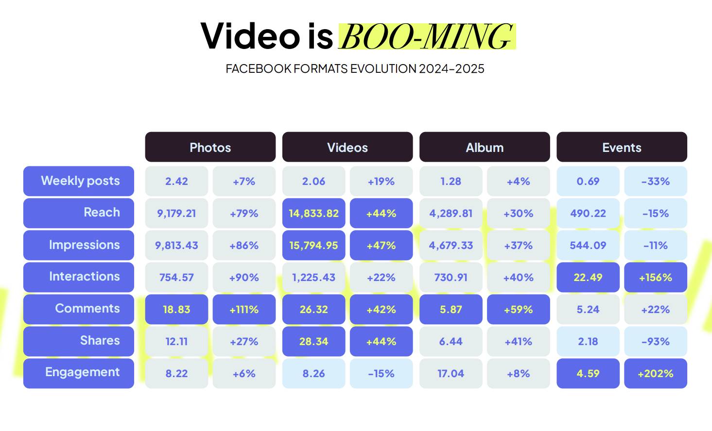 What’s happening? Video is now the strongest-performing format on Facebook. From 2024 to 2025, video reach jumped 44%, impressions rose 47%, interactions increased 22%, and shares climbed 44%. While photos are still posted more frequently, video clearly wins where it matters most: visibility and engagement.