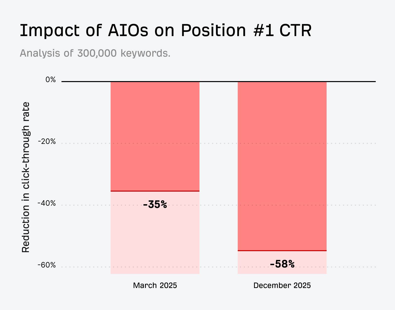 Ahrefs’ AI Overview analysis ran fresh data last December and the drop got brutal. When an AI Overview appears, the top-ranking page now gets 58% fewer clicks. Earlier last year, it was already bad at 34.5%. And it appears, this is exactly what Google wants: zero-click search. AI Overview answers the query, users stay longer on Google.