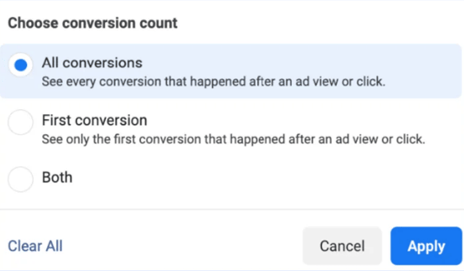 With the new breakdown called Conversion Count, you now see first conversions vs all other conversions inside the same attribution window. If one person buys twice, you actually see that now.